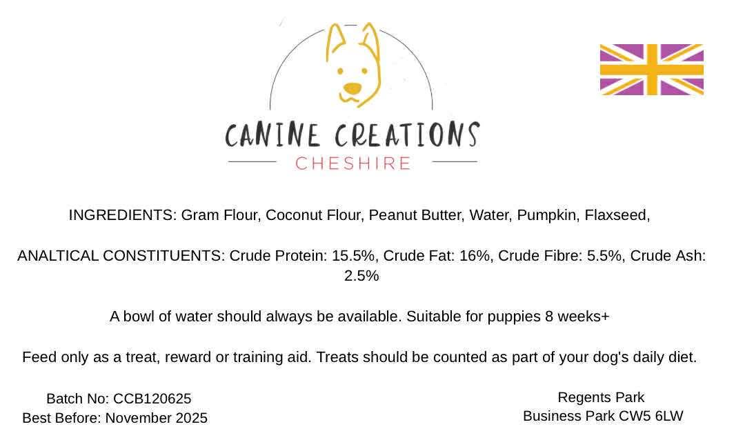 Our VERY own Tinkerbell’s Treats home baked biscuit from the wonderful Canine Creations. For ingredients please see images.